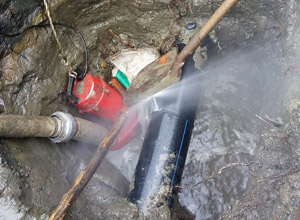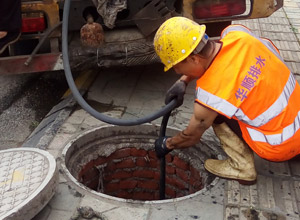 (5)使用高压清洗车进行管道疏通,将高压清洗车水带伸入井低部,进行清洗;